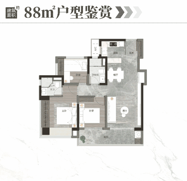 入户玄关,LDKB一体化设计,套房式主卧设计,刚需相当友好。