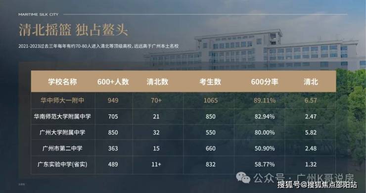 2021-2023年,华中师范大学第一附属中学每年都有约70-80人进入清北等国内顶级高校。这个数据很恐怖,拿广州神学院华附来说,每年进入清北20-30人,广东最牛的中学——深圳中学2023年进入清北的49人,广大附中也只有15人,差距比较明显!