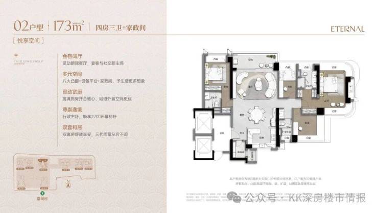 采用双龙抱珠格局,灵活适配成长型家庭。LDKB一体式布局,配备270°环幕主卧套房、U型厨房及七大飘窗,空间动静分离,实用且可变。