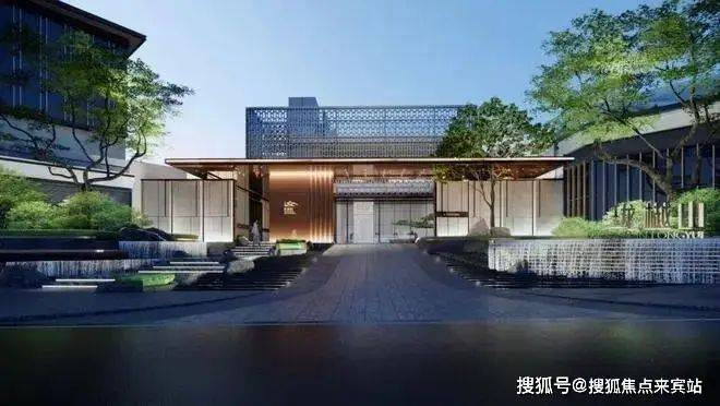 小区是往现代高端社区方向打造,步行大门是山林水石设计,而车行出入口则设计了酒店级回旋处落客区,跟「胤璞」很像。