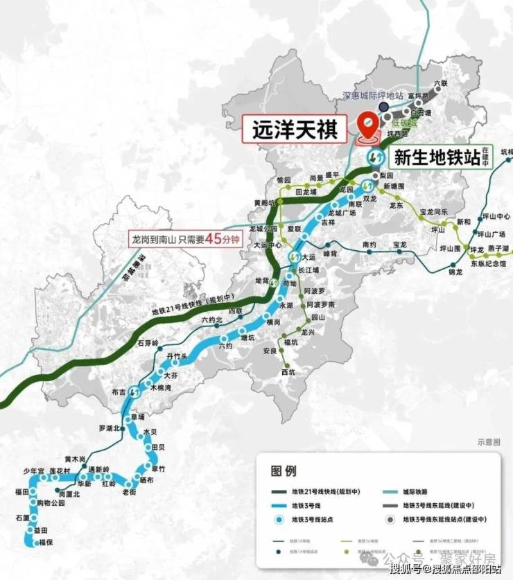 交通配套:远洋天祺距离地铁3号线东延线(在建中,预计2025年通车)和21号快线(规划中)双轨交汇“新生站”(建设中)直线距离仅约500米(百度地图测距),是片区离地铁最近的在售项目,未来还有深惠城际前海保税区至坪地段,全长58公里,时速160公里/小时,以后从项目到南山、前海也很方便快捷。