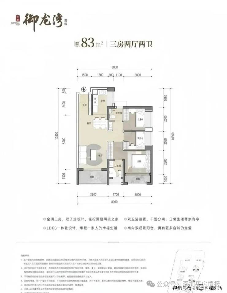 83㎡3房2卫,分布在2栋2单元03/04户型,设计的是竖厅格局,客厅开间3.3米,LDKB一体化设计,三开间朝南,U型厨房,公卫三段式分离设计,得房率约79.25%(不含赠送),东南或西南朝向,加上赠送得房率约89%