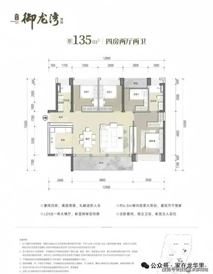 135㎡4房2卫,设计的是横厅南北通透格局,客餐厅开间6.8米,LDKB一体化设计,四开间朝南,U型厨房,公卫三段式分离设计,得房率约79.25%(不含赠送),阳台主朝东南或西南向,加上赠送得房率约90%