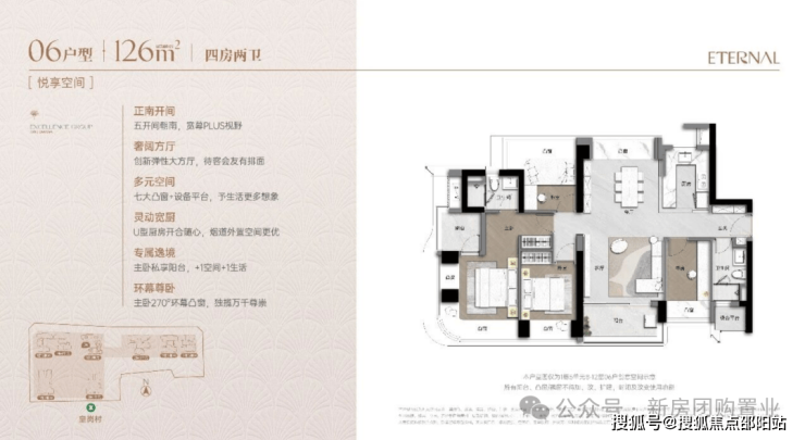 126㎡四房两卫(约1257-1427万):创新户型,弹性大方厅设计,搭配270°环幕视野,俯瞰福田城市景观,主卧套房带独立卫浴与衣帽间,提升居住舒适度。