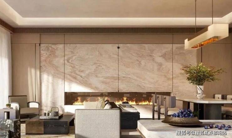 在室内,客厅背景墙使用了罗马假日天然石材,营造出含蓄高级的氛围,立体层次感非常强。