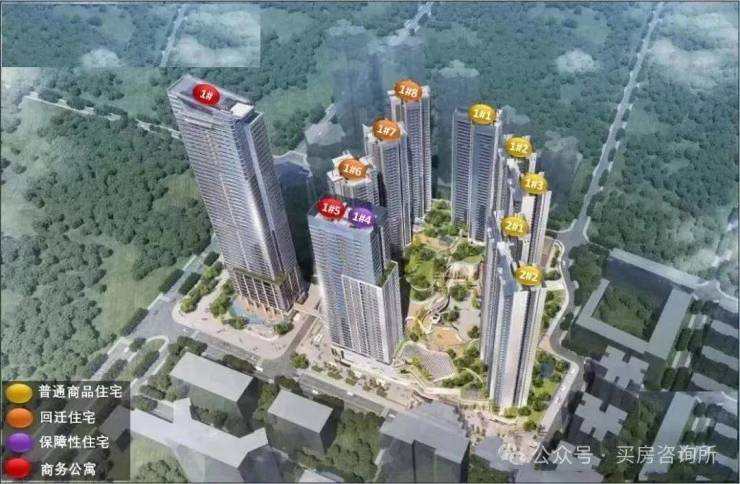 其中1栋1单元/2单元/3单元和2栋1单元/2单元为商品房,1栋4单元为保障房,1栋5单元为商务公寓,1栋6单元/7单元/8单元为回迁房,3栋为幼儿园。