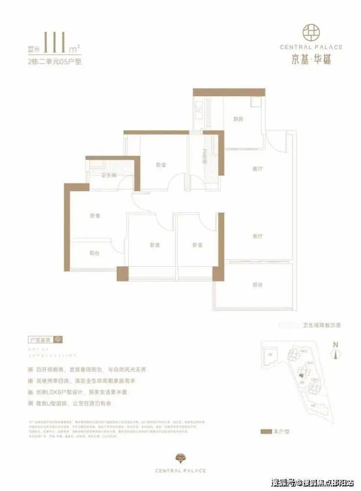 仅2栋2单元05户型才有,设计的是经典竖厅格局,LDKB一体化,动静分区,四开间朝南,U型厨房,卫生间干湿分离,得房率约73%(不含赠送),阳台西南朝向。