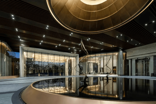 艺术雕塑之下的循环水景,倒映着的夜晚,流光溢彩,呈现如此绚丽景致的背后,是各项细节与工艺的深层考究和应用。它在设计上有个非常大的亮点,抬头看去,雕塑上方的穹顶流动了水波纹,与4楼架空层园林方形的水墨台浑然一体,同时天气晴朗时,阳光射下来,也会映射到下面的水面上,波光粼粼。象天法地,天圆地方,也象征着源源不断的财运。