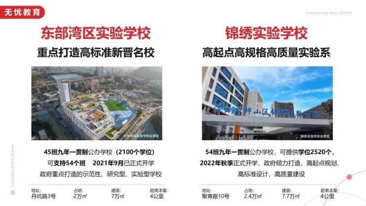 项目自带一所18班幼儿园和一个36班小学,周边有坪山同心外国语学校、坪山外国语文源学校、南科大附属坪山学校、坪山东部湾区实验学校、坪山锦绣实验学校5大学校,可谓学府资源丰饶。(学区划分以教育局公布为准
