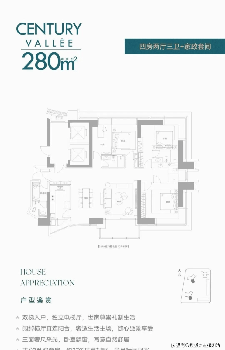 【约233㎡3+1房3卫】双梯入户,独立电梯厅,餐客大横厅贯通阳台,三面采光,主次卧尽享270°环幕视野,还有独立家政套间,西北朝向看名商和沙河高尔夫