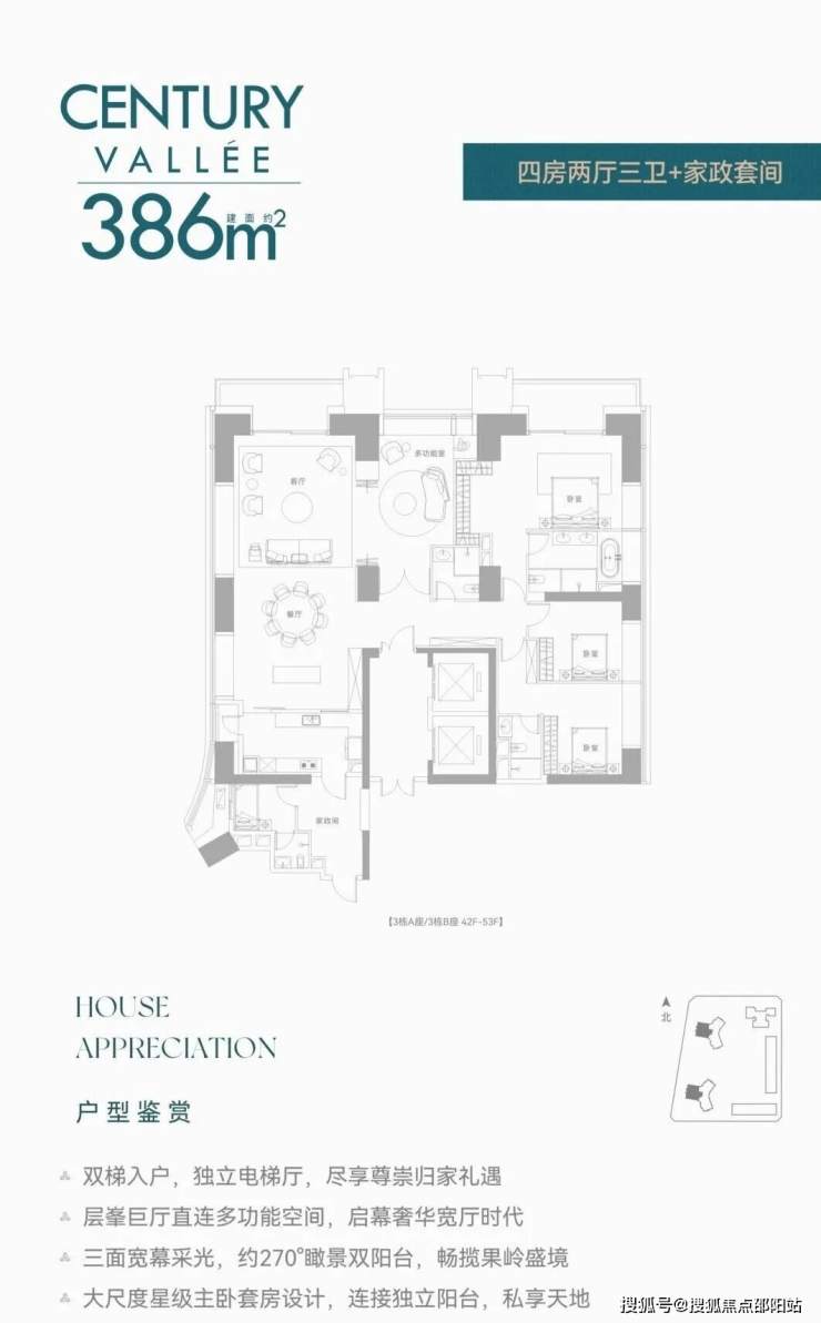 【约386㎡4+1房4卫】双梯入户,独立电梯厅,阔绰横厅直连多功能空间,三面舒适采光,主次卧双套房,270°环幕视野,还有独立家政套间,西朝向看名商高尔夫和大河沙生态长廊。