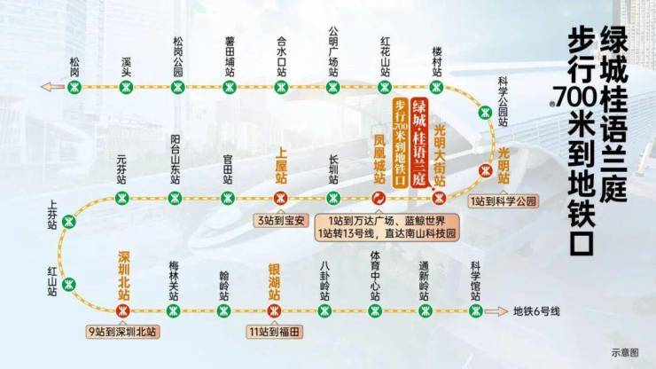 绿城桂语兰庭的交通条件极其便捷,项目周边紧邻地铁6号线光明大街站和地铁6号线支线光明站,步行距离分别约为200米和500米(或600米的不同说法,但均属便捷范围)。