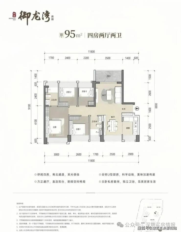 95㎡4房2卫,分布在2栋1单元06户型,设计的是竖厅南北通透格局,客厅开间3.5米,五开间朝南,U型厨房,公卫三段式分离设计,得房率约79.25%(不含赠送),阳台主朝东北向,加上赠送得房率约93%