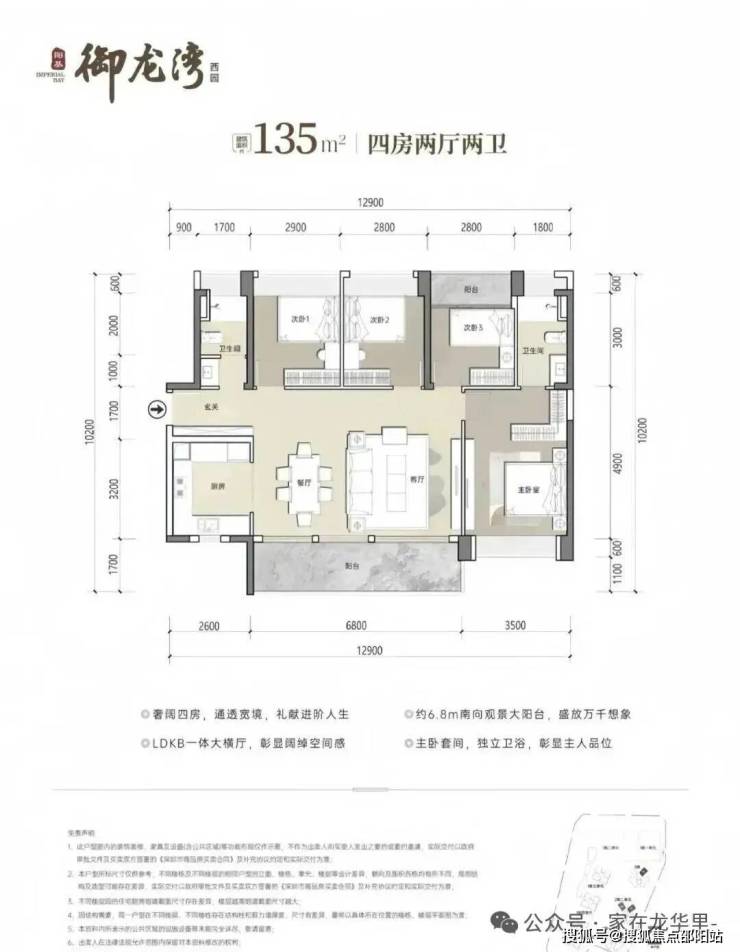 135㎡4房2卫,设计的是横厅南北通透格局,客餐厅开间6.8米,LDKB一体化设计,四开间朝南,U型厨房,公卫三段式分离设计,得房率约79.25%(不含赠送),阳台主朝东南或西南向,加上赠送得房率约90%