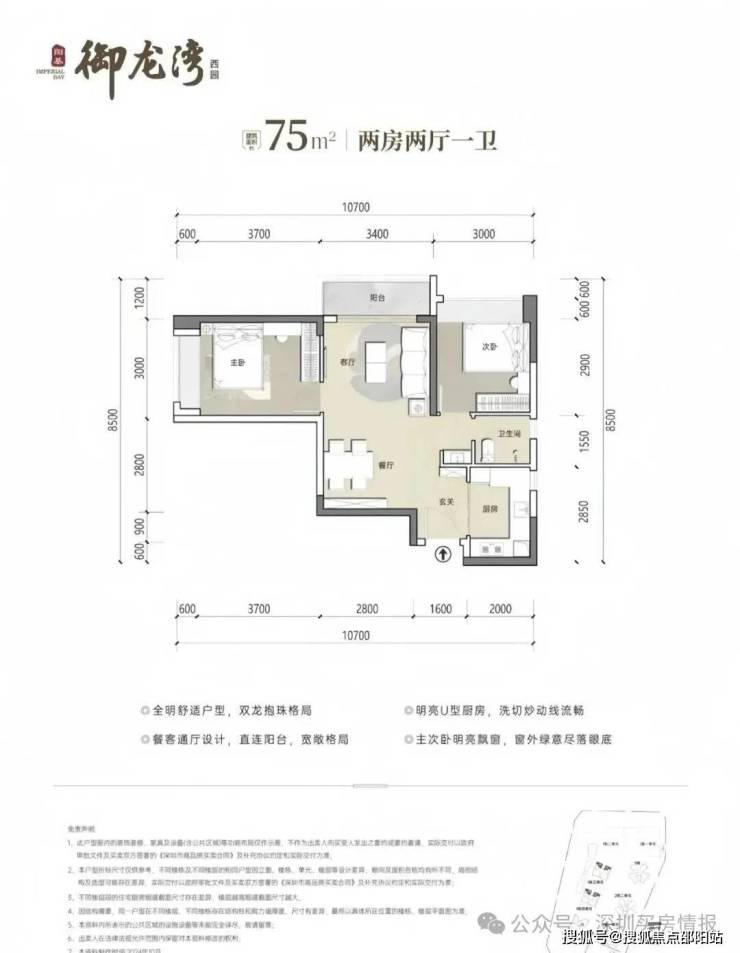 75㎡2房1卫,分布在1栋3/4单元03/06户型,设计的是竖厅稀缺的双龙抱珠格局,客厅开间3.4米,U型厨房,卫生间三段式分离设计,得房率约73.26%(不含赠送),东南或西北朝向,加上赠送得房率约80%