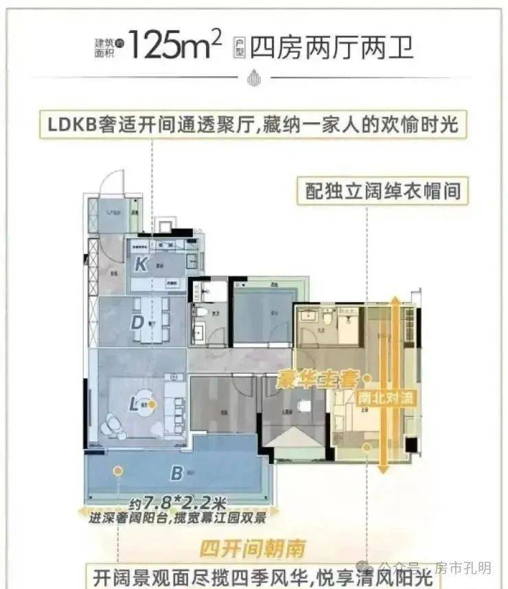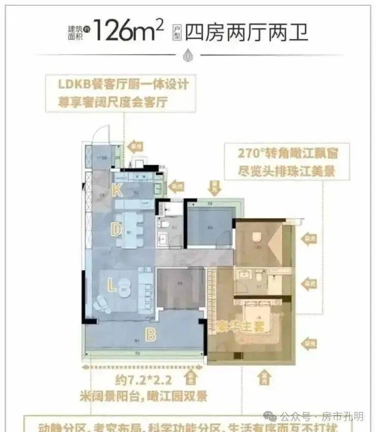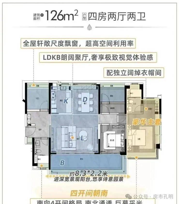 建面125平四房,四开间朝南设计,还有接近17平的巨幕阳台,超开阔的视野。