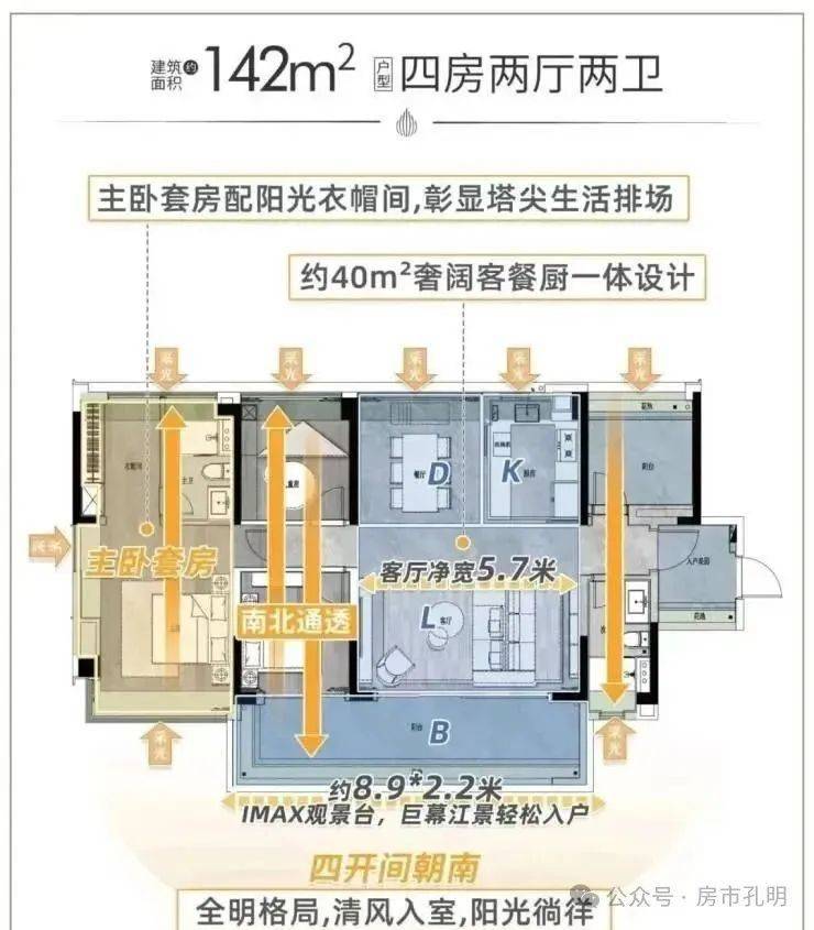 建面142平四房,四开间全明设计,采光非常好,南北对流设计,2.2米宽的阳台。