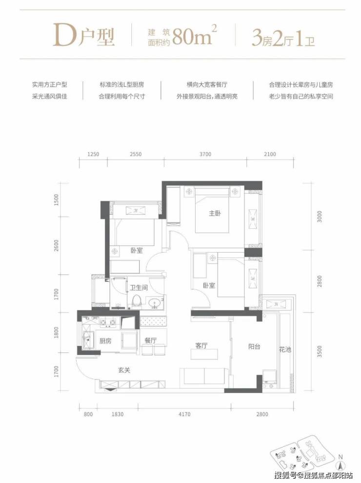 85㎡的3房2厅1卫,设计的是竖厅格局,客厅3.5米开间,进门玄关,LDKB一体化设计,动静分区,3个卧室分别做到了3米/2.8/2.55米的宽度,L型厨房,卫生间干湿分离,得房率72.48%(不含赠送),有朝东向或西向。