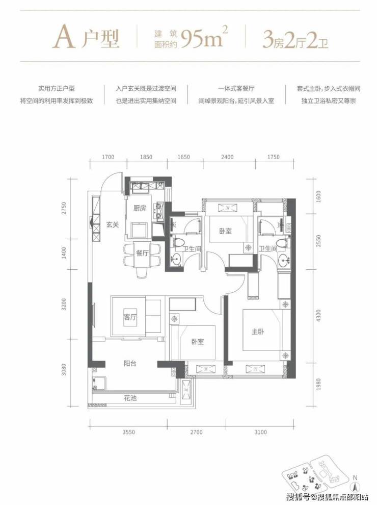 95㎡的3房2厅2卫,设计的是竖厅格局,客厅3.55米开间,进门玄关,LDKB一体化设计,动静分区,三开间朝南,3个卧室分别做到了3.1米/2.7/2.4米的宽度,L型厨房,卫生间干湿分离,得房率72.48%(不含赠送),有东南、西南或正南朝向。