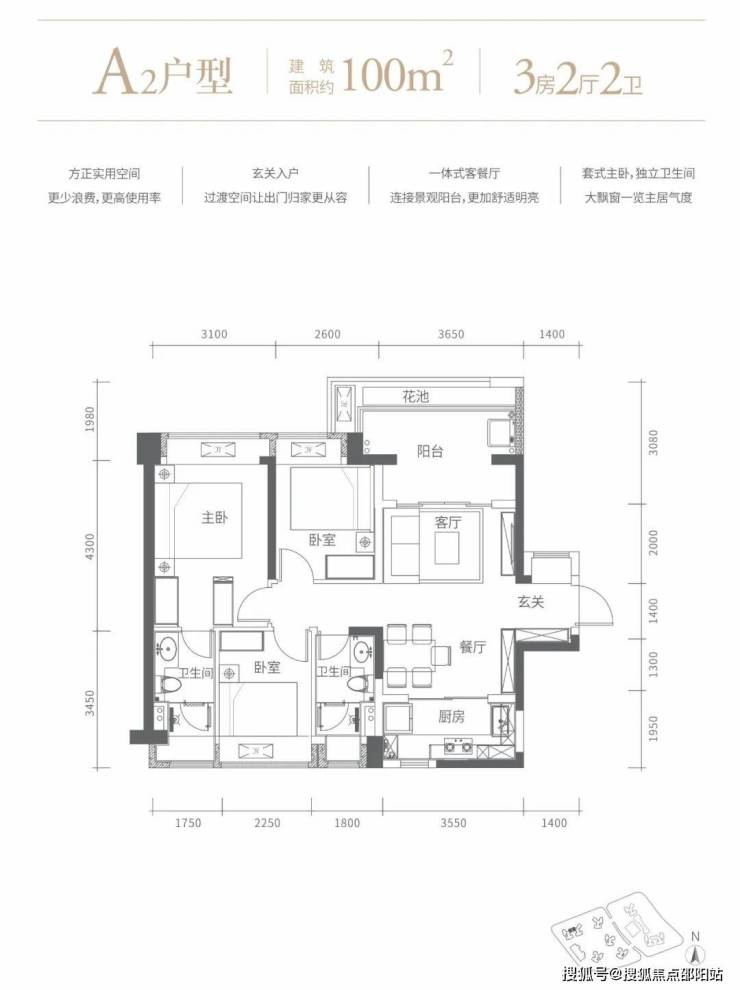 100㎡的3房2厅2卫,A2户型,设计的是竖厅格局,客厅3.65米开间,进门玄关,LDKB一体化设计,动静分区,3个卧室分别做到了3.1米/2.6/2.25米的宽度,L型厨房,卫生间干湿分离,得房率72.63%(不含赠送),阳台主朝东北向。