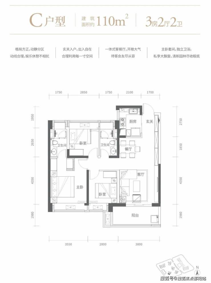 110㎡的3房2厅2卫,A2户型,设计的是竖厅格局,客厅3.8米开间,进门玄关,LDKB一体化设计,动静分区,三开间朝南,3个卧室分别做到了3.55米/2.85/2.8米的宽度,L型厨房,卫生间干湿分离,得房率73.97%(不含赠送),西南朝向。