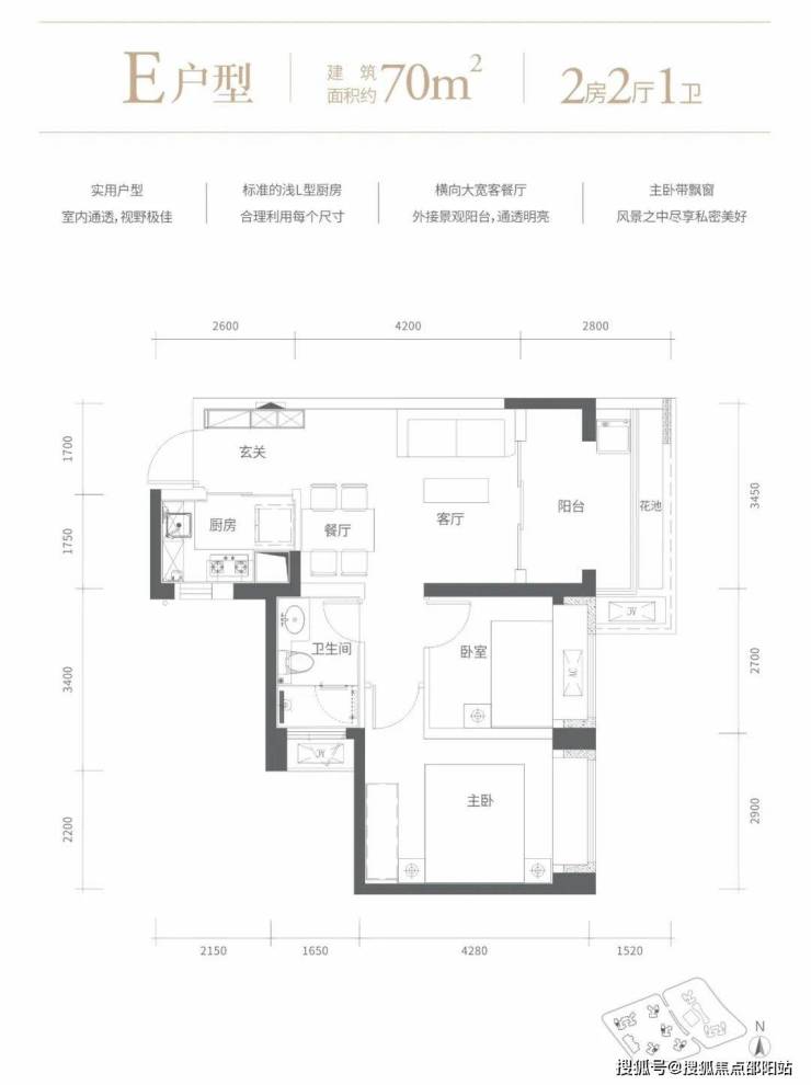70㎡的2房2厅1卫,设计的是竖厅格局,客厅3.45米开间,进门玄关,LDKB一体化设计,2个卧室分别做到了2.9/2.7米的宽度,L型厨房,卫生间干湿分离,得房率72.47%(不含赠送),有朝东向或西向。