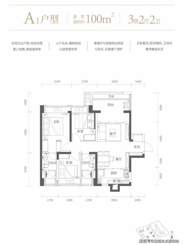100㎡的3房2厅2卫,A1户型,设计的是竖厅格局,客厅3.55米开间,进门玄关,LDKB一体化设计,动静分区,3个卧室分别做到了3.1米/2.7/2.3米的宽度,L型厨房,卫生间干湿分离,得房率72.63%(不含赠送),阳台主朝西北向。