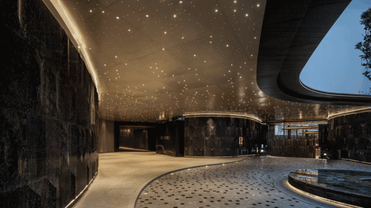 真正的震撼,在于项目以“入住即成林”在CBD极核勾勒出「隐秘的繁盛」。主入口约67米奢阔景墙如折页般展开,园心那棵广州最大最高的麻楝树王(高度约14-15米)傲然挺立。不仅如此,一期的园区更至少以数十种奢石,让日常行走都变成一场美学巡礼。像入口处马达加斯加蓝翡翠奢石雕琢“玉璧水景”、门厅地面铺开安缦酒店同款安哥拉灰,与巴西铂金钻大理石交织……