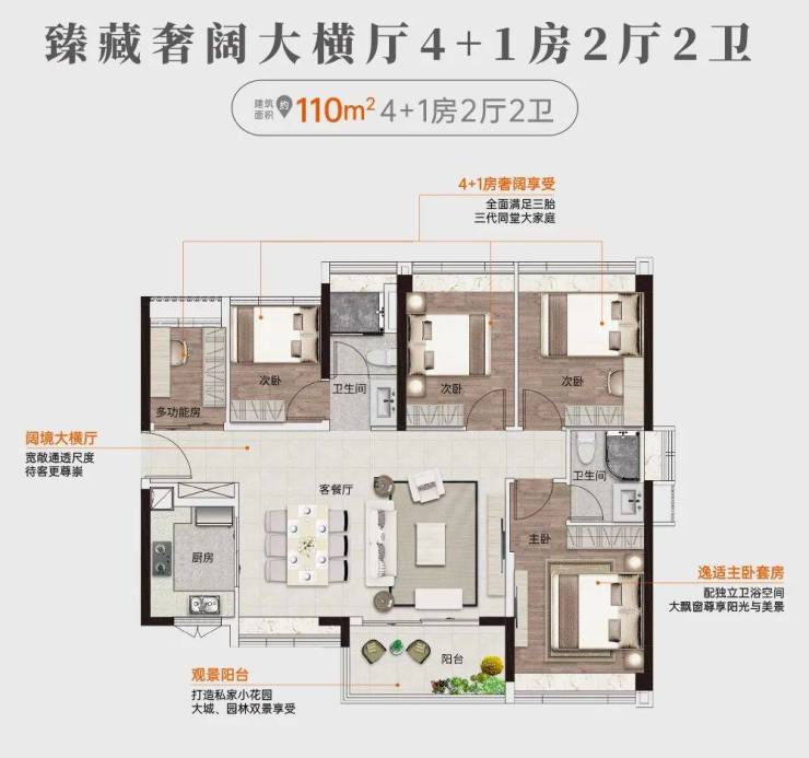 建面约110㎡大横厅五房