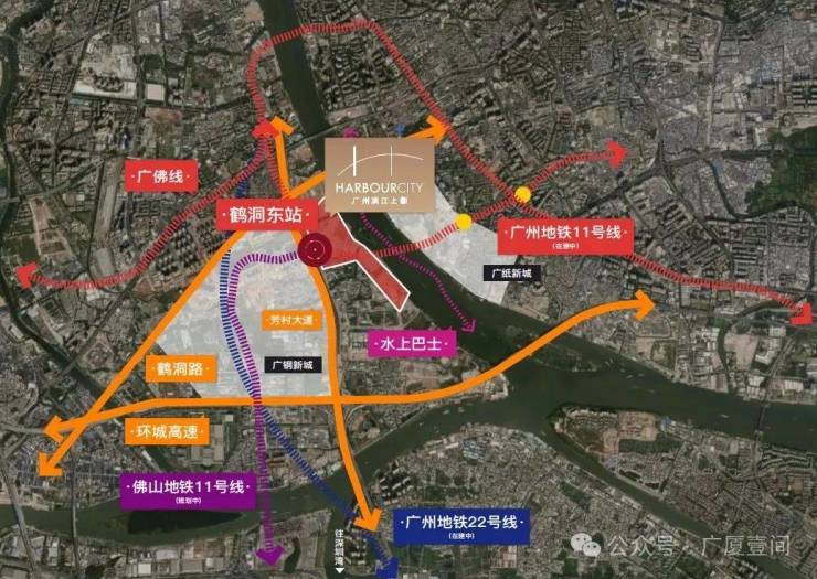 交通上,有广州11号线以及佛山11号线鹤洞东站双地铁上盖,3横2纵大路网+公交站场+水上巴士,集水、陆、轨等多维交通方式于一体。