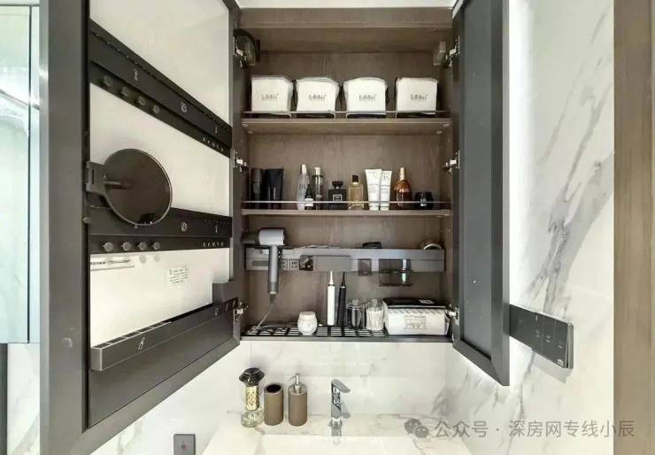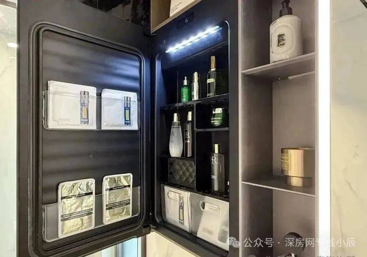 卫浴方面用了汉斯格雅、唯宝和杜拉维特,品牌定位也是相当凑合。另外主卫还配备了美妆冰箱,牙刷除菌的收纳柜。