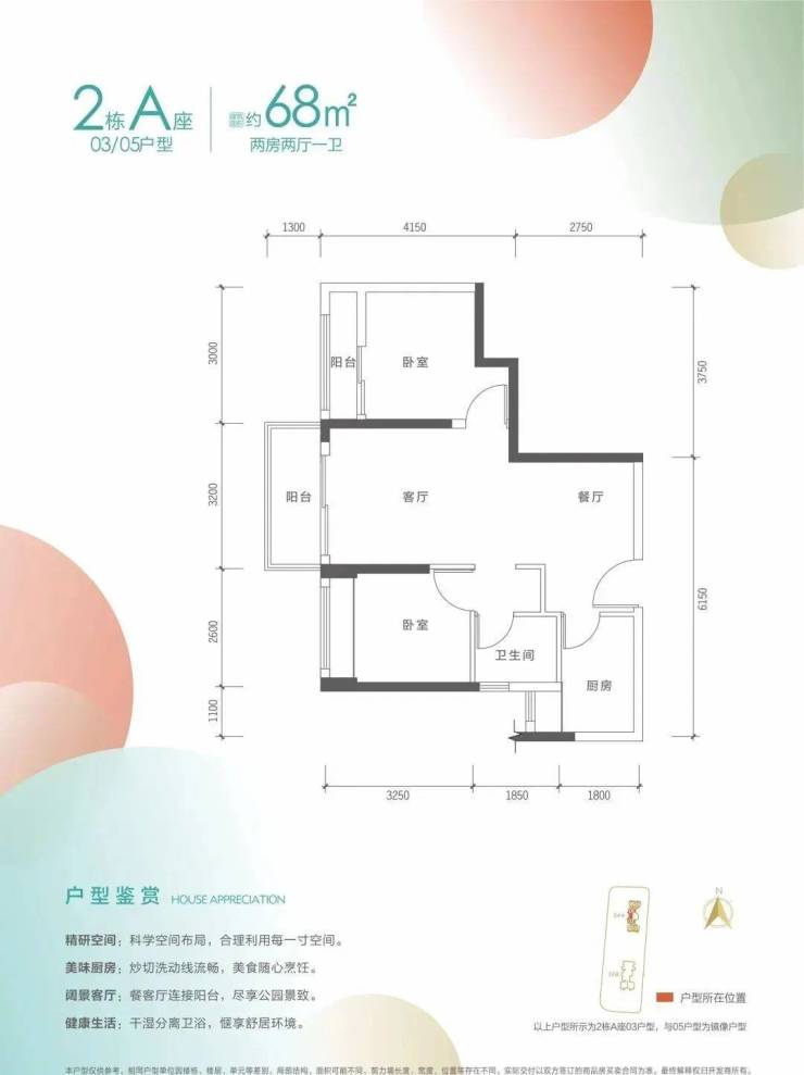 68㎡的2房2厅1卫,2栋A座03.05户型,设计的是竖厅类双龙抱珠格局,客厅3.2米开间,2个卧室分别做到了主卧10.05㎡/次卧8.58㎡(包含墙体飘窗),得房率约74.05%(不含赠送),朝正西向。