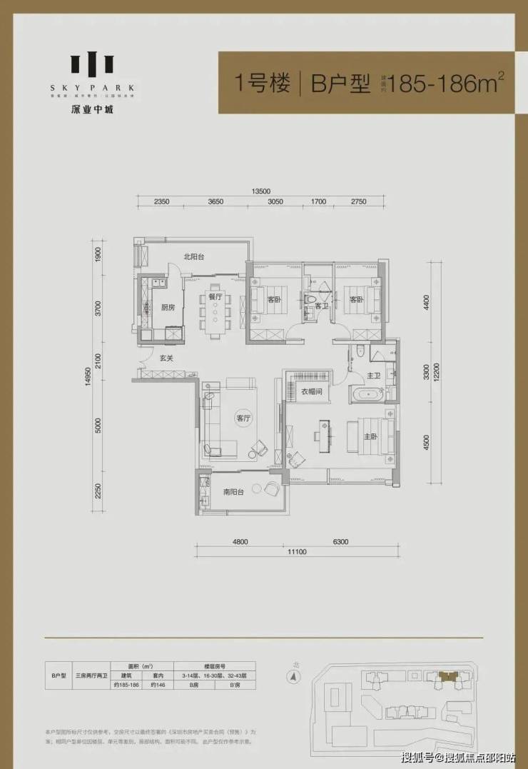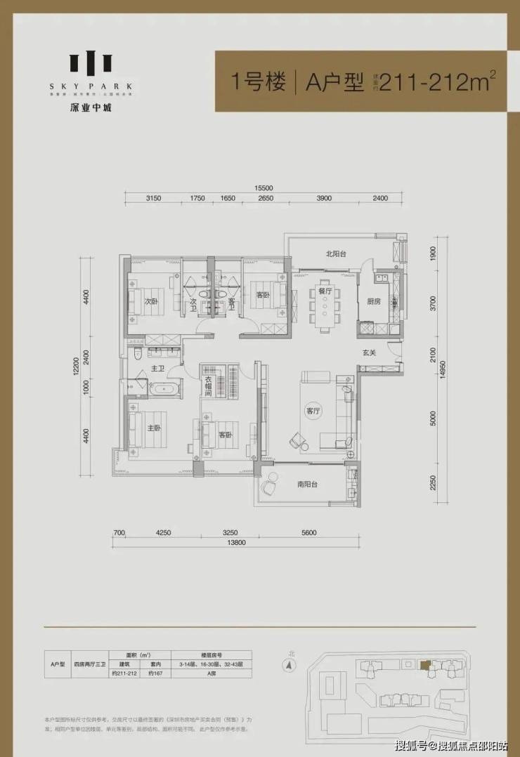 1栋:产品是面积段为137-185-192㎡的3房、212㎡的4房、以及4套300㎡以上的顶层复式单位,其中36层及以下为2梯3户“品”字形结构,37层及以上为2梯2户的板楼结构;