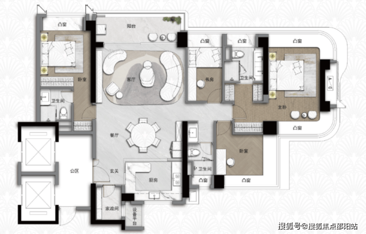 123/126㎡四房两厅两卫:南北通透,约 4.2 米宽厅,LDKB 一体化设计;四开间朝南,六大凸窗 + 设备平台;主卧套房带独立卫浴与 270° 飘窗,适合三代同堂的改善家庭。