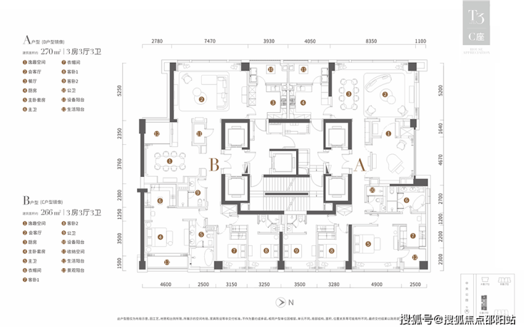 T3栋为266平和270平3房3厅3卫户型。266平主卧套房设计带有衣帽间、卫生间和景观阳台,功能齐全。次卧大小分布均衡。两个户型卧室设计均为同朝向,近40平会客厅,空间阔绰,且拥有优越的景观视野。