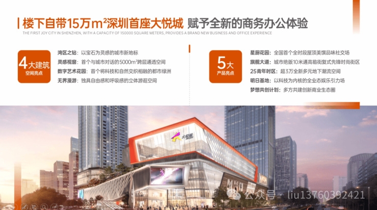 ● 约73万㎡大悦城综合体之上,项目涵盖约15万㎡大悦城旗舰商业、约13万㎡总部办公、壹号华宅、潮奢寓等多元业态,以强大资源聚合能力,将商务、商业、居住、生态等融为一体,打造城芯大悦生态圈,开拓更为开放、融合、多元的商务场景,成就未来总部商务聚核效应。