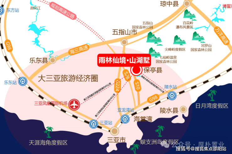 项目地处保亭,大三亚1小时生活经济圈内;距凤凰机场直线距离约45公里,三亚高铁站直线距离约为40公里,陵水高铁站直线距离约为30公里,50分钟左右可到达;30分钟车程可到达国家海岸《海棠湾旅游度假区》,《解放军301医院》,50分钟左右到达三亚市行政中心区;20分钟车程可到达保亭著名《七仙岭温泉国家森林公园》、《呀诺达雨林文化旅游区》;40分钟到达《海南槟榔谷黎苗文化旅游区》;50分钟可到三亚《天涯海角游览区》、《南山文化旅游区》及《蜈支洲岛旅游区》;30分钟可达陵水的《黎安国际教育创新试验区》自贸港建设必不可少的《海南大学城》;