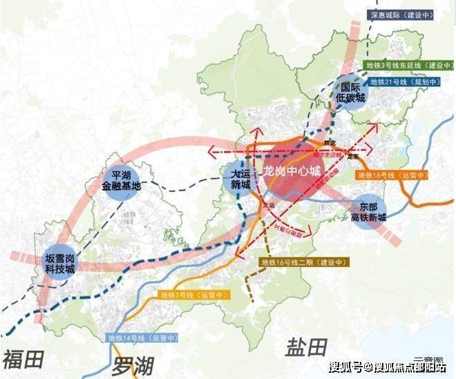 提到龙岗,大部分人脑海中首先浮现便是龙岗中心城,这个已发展30余年的板块,几乎成为了龙岗的代名词。本案所在的龙东片区距离龙岗中心城约5公里,临近地铁16号线龙东站,在龙岗“一轴、两带、三通廊”城市规划中,地铁16号线是特殊且重要的一条线路,它的开通是进一步落实东进战略的重要举措,将链接龙岗中心城、大运中心、坪山高铁中心三大板块,推动龙中居住区域板块整体向东外拓,建设“龙城2.0”居住区。 在龙岗发展一路向东的大趋势下,依托地铁3/16/14号线的轨道交通效能,“东部副中心”强势崛起,地铁16号线东轴方向成龙岗中心城外拓首站,“一芯两核多支点”战略赋能、超百万方城市更新推进,多重势能叠加,区域未来可期①。