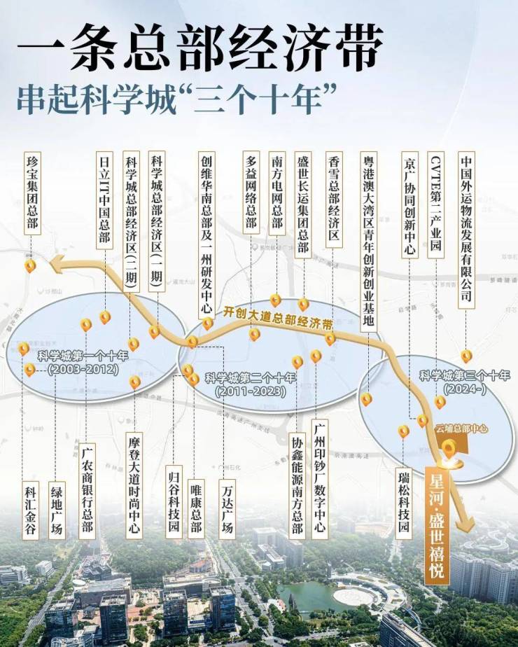 ●开创大道是科学城最光鲜的门面担当,作为“总部经济带”,聚集了南方电网、创维、日立IT等二十多个企业总部,它的重要地位,类似于广州新中轴,串起了科学城的过去、现在和未来
