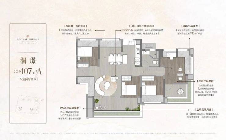 比如107平A户型做到15米南向四开间,南北对流,拓展成横厅后会更加通透。