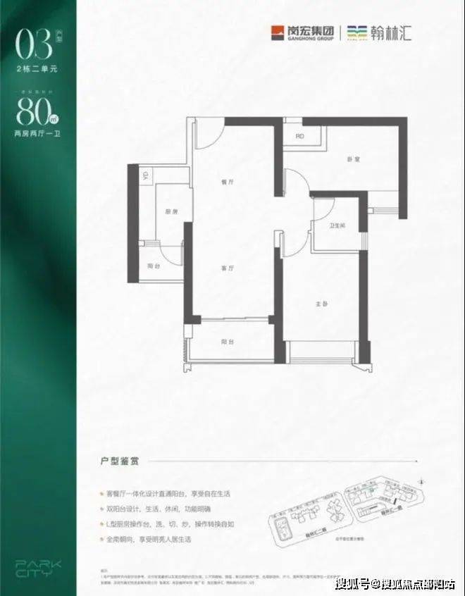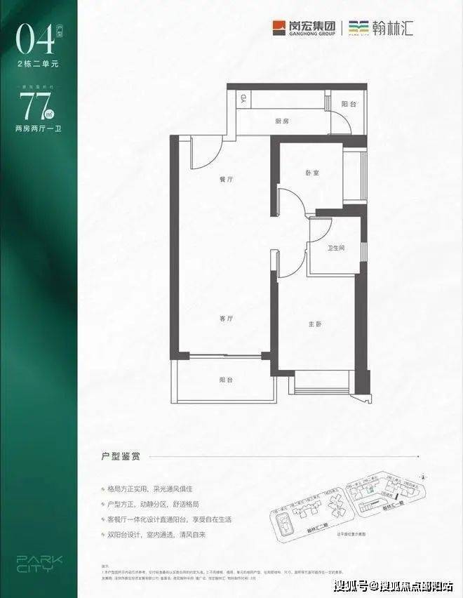 77㎡的2房2厅1卫,设计的是竖厅格局,客餐厅一体化,客厅3.3米开间,2个卧室分别做到了2.95米/2.4米的宽度,一字型厨房,还带1个小生活阳台,东南朝向,