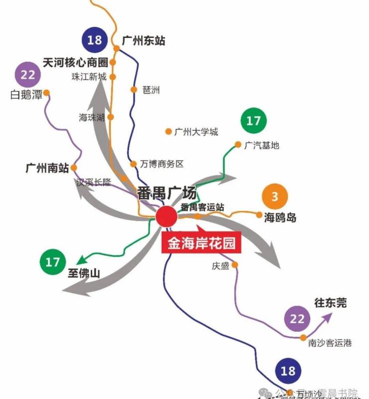 5轨交汇,雄踞双TOD枢纽中心尊处番禺客运站与番禺广场双TOD,五轨交汇(3号线/3号线东延线/18号线/22号线/17号线),一横五纵大动脉畅通四方。