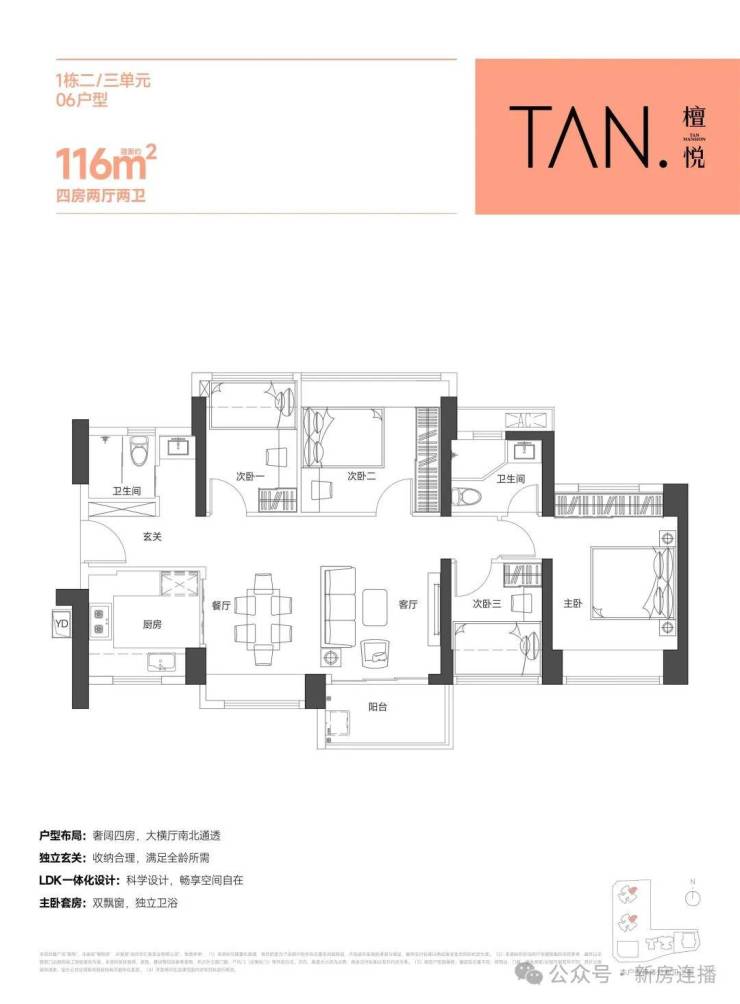 116平:4房2厅2卫,南北通透,使用率74.34%(不包含赠送面积)