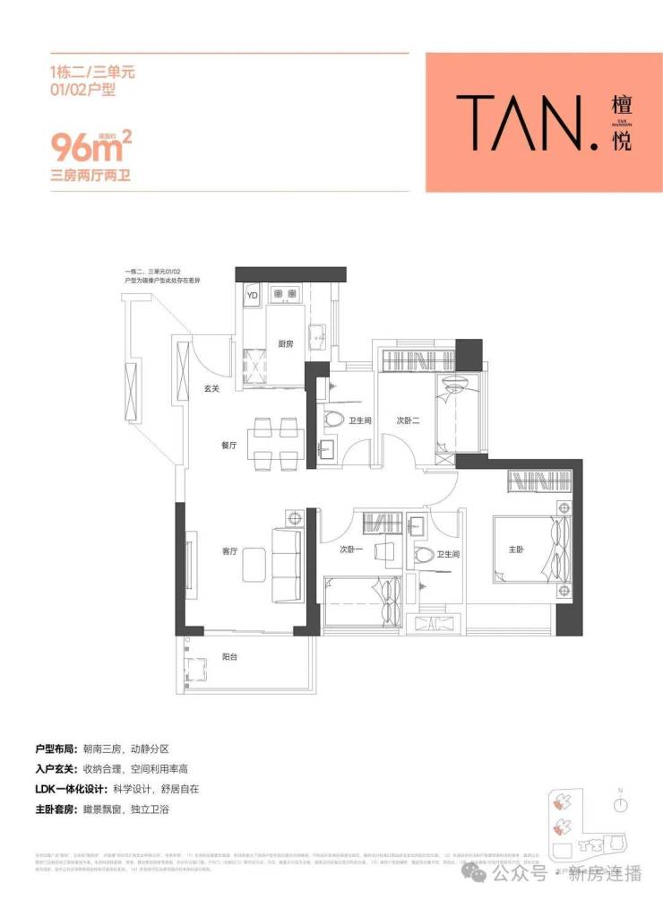 96平:3房2厅2卫,西南朝向,使用率74.34%(不包含赠送面积)