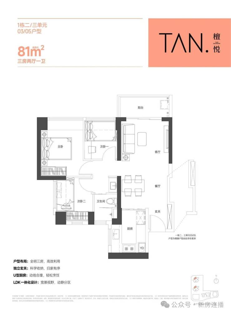 81平:3房2厅1卫,西北朝向,使用率74.34%(不包含赠送面积)