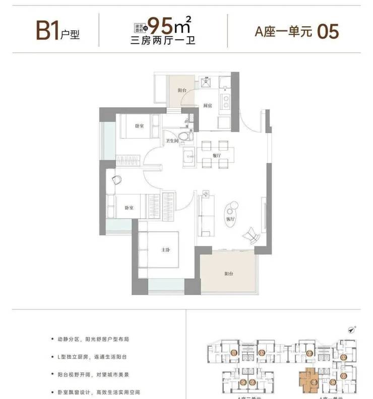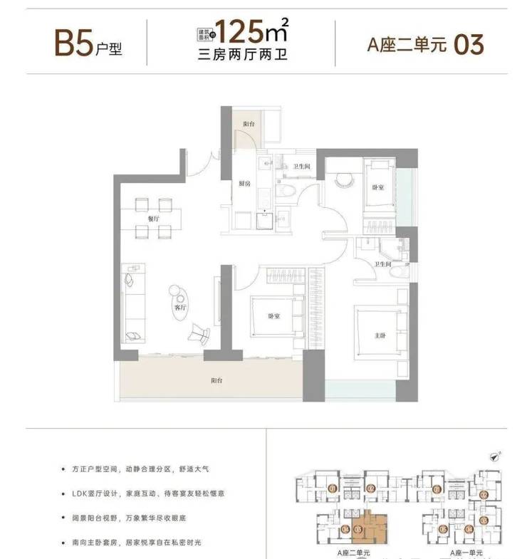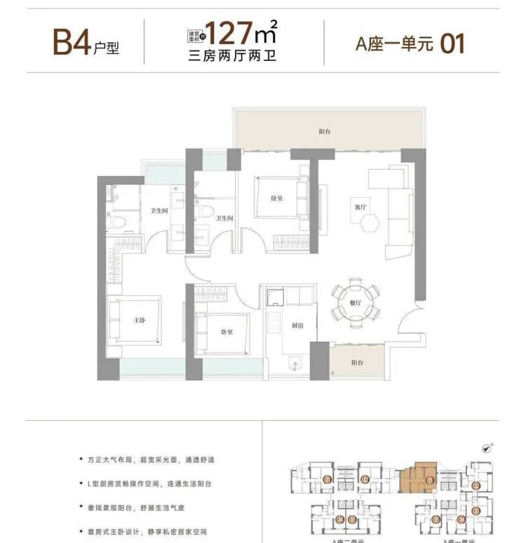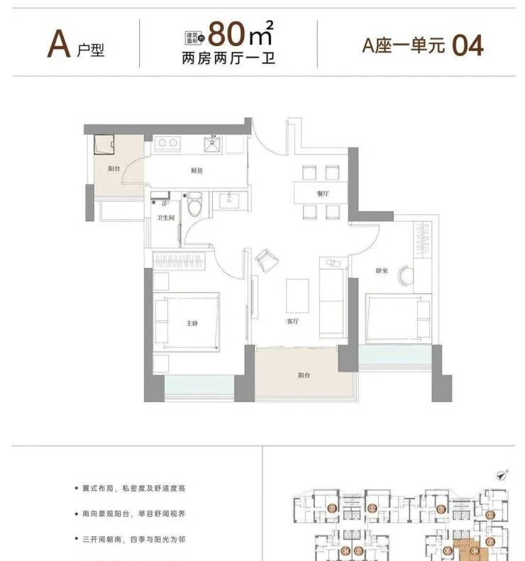 1栋A座一单元四梯五户约80-127㎡2-3房,户型方正·双阳台;