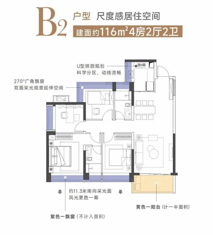 非常理想的4个房间的布局,4开间朝南向。几乎每个房间都是满开间的飘窗增加使用率,次卧还可以做270度的一个转角飘窗,实现双面采光,主要就是配置了一个多功能的套房设计,居住更舒适。户型