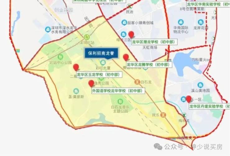 教育方面,项目距离深圳外国语学校(龙华学校)773米,步行11分钟,深国外是龙华排名前三的名校。周边还有玉龙学校(距离941米,步行约14分钟)、龙腾学校(新学校,距离847米,步行约11分钟)等教育资源。不过据悉,保利招商龙誉与深外龙华校区小学无缘,项目在新建的龙腾学校范围内,初中为龙腾学校、玉龙学校和深外龙华校区三所学校共享学区。(具体以教育局最新公布为准)。
