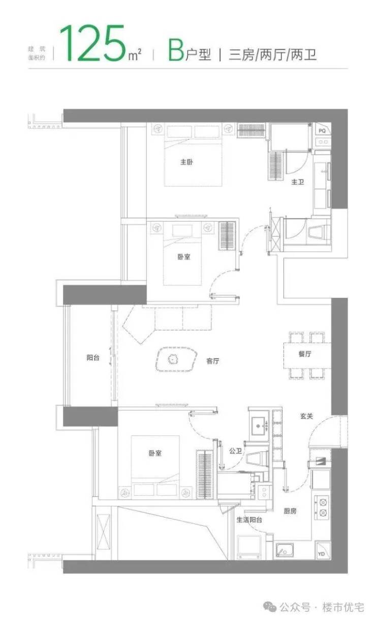 B户型 建面约125㎡三房两厅两卫