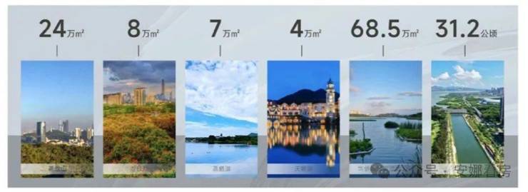 约3.4平方公里中央公园、约24万m2燕晗山郊野公园、约68.5万m2华侨城国家湿地公园、深圳湾超总十字生境、绿景白石洲约1.2公里中央绿轴,约15km滨海长廊,与华侨城三大主题公园,共同组成深圳超级公园带,每一次呼吸与远眺,都有来自国家级生态保护区的气息
